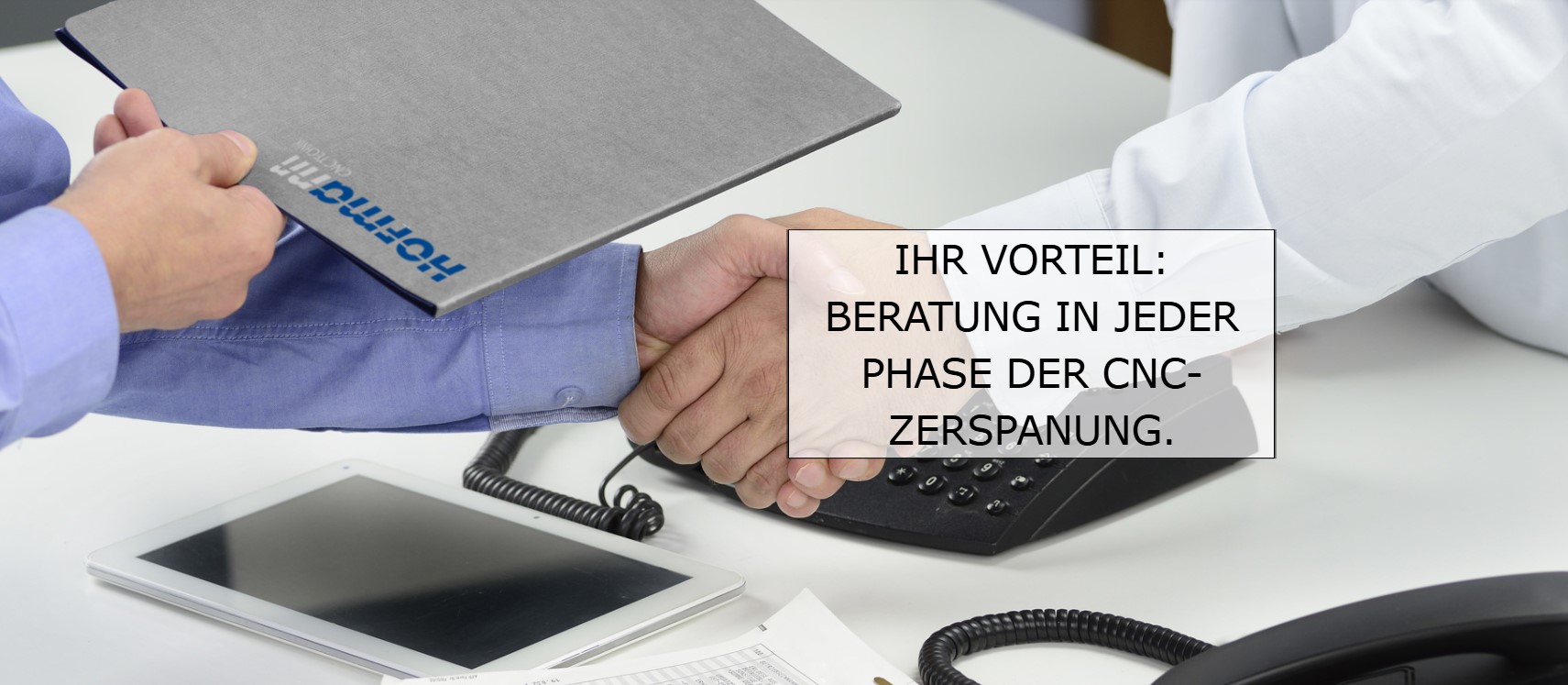 Hofmann CNC Technik bietet Ihren Kunden außergewöhnlich umfangreiches Fachwissen in jeder Phase des Entstehungsprozesses der Bauteile.Das heißt, schon nach Abschluss der Vorkonstruktion am Computer haben Sie als Kunde die Möglichkeit, das entworfene Teil bei Hofmann CNC-Technik auf seine effiziente Realisierbarkeit überprüfen zu lassen sowie Vorschläge zur weiteren Optimierung einzuholen.Das gilt selbstverständlich auch im Hinblick auf mögliche Zeit- und Kostenreduktionen. Dieses hohe Beratungsniveau macht Hofmann CNC-Technik zu einem idealen Partner vor allem für Kunden ohne eigene Fertigung.